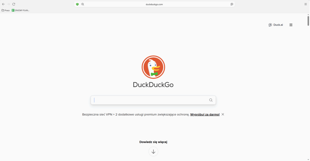 - Using “bangs” (search shortcuts): In the search bar, you can use shortcuts like !w, !yt, !gh to instantly search a specific page (e.g., !w Warsaw job – Wikipedia search). This is a quick way to direct your query to a specific website.